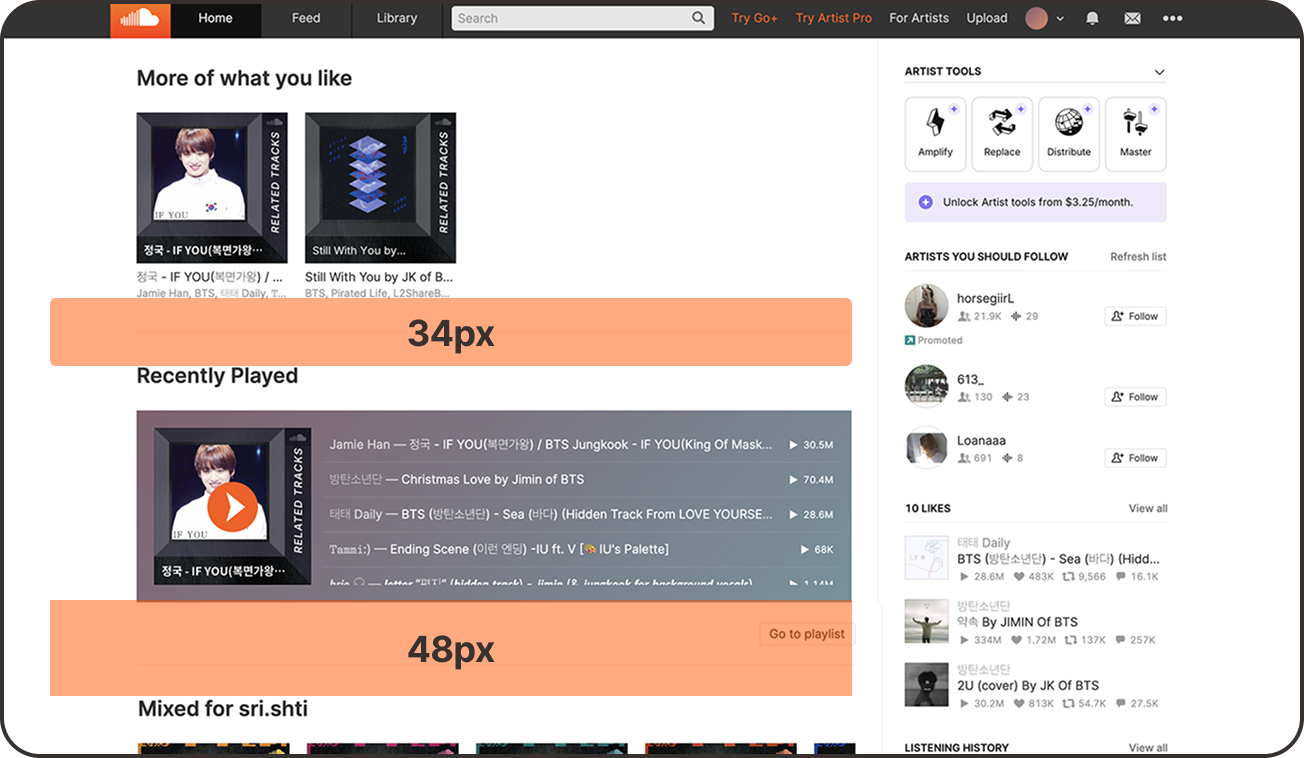 SoundCloud uses an inconsistent spacing grid which created visual inconsistencies when scrolling down any given page.