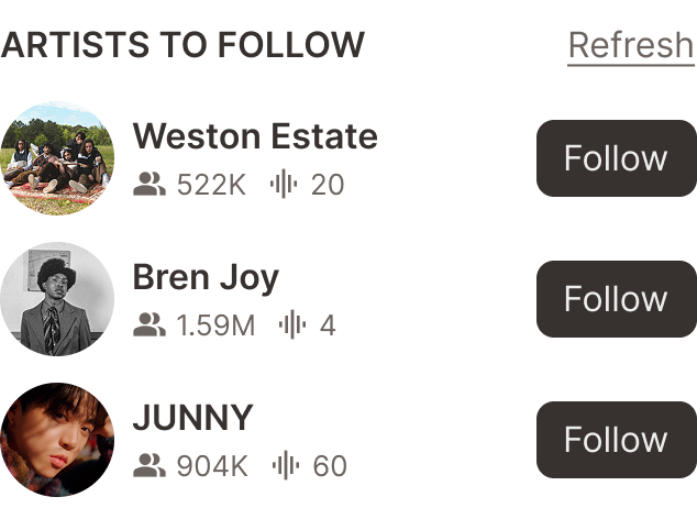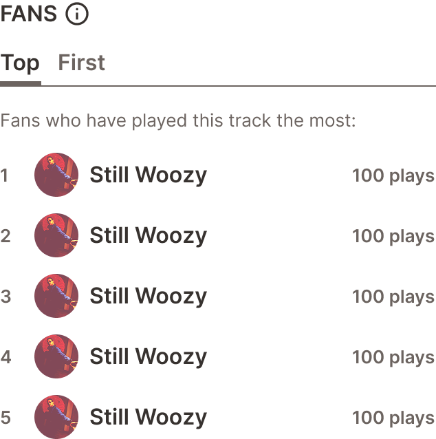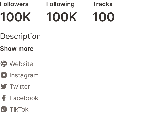 Sidebar Elements live on almost every page in one of the five forms above, and give users vital information about their own activity or the activity of the profile they are on. This was one of the hardest components to design as it needed to be the same width to fit into the sidebar shell, but each version had completely different subcomponents to showcase tracks, user profiles, user profile details, comments, and top/first fans.