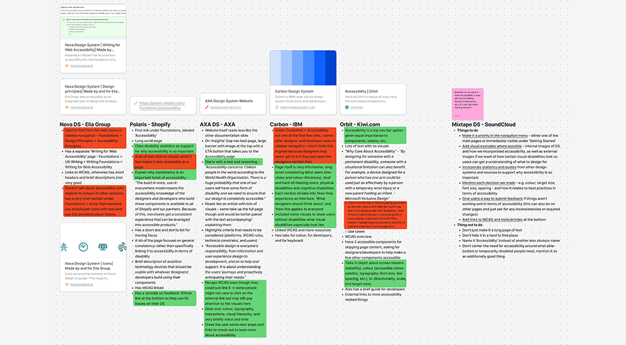 When deconstructing, and later designing for this project, I knew I wanted to be involved in writing Mixtape’s accessibility guidelines. While I had a good understanding of accessibility standards with regards to WCAG, I wanted to understand how other successful design systems were guiding their users on how to design with accessibility at the forefront. I did a short competitive analysis of 5 design systems, including Carbon by IBM and the AXA design system, and came out with a list of things I wanted to include in Mixtape’s accessibility guidelines.